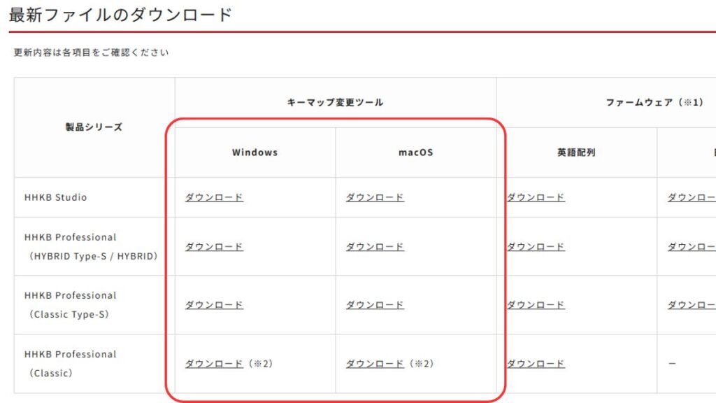 ダウンロードページにアクセスしたら、自分のモデルに合ったツールを選択してください。前述のとおり、「HHKB Studio用」と「Professional用」でツールが分かれているので、ここを間違えるとインストール後に認識されません。