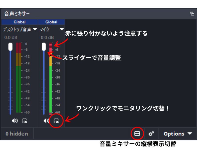 OBS 32.1の音声ミキサーは初期状態では縦表示ですが、横表示(水平レイアウト)に切り替えることもできます。音声ミキサー内にあるレイアウト切替アイコンをクリックすることで、縦と横を交互に切り替えられます。