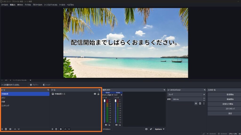 つまり、シーンは「画面レイアウトの単位」、ソースは「その画面に配置する個々の要素」です。1つのシーンの中に複数のソースを重ねて、配信・録画の画面を構成していきます。